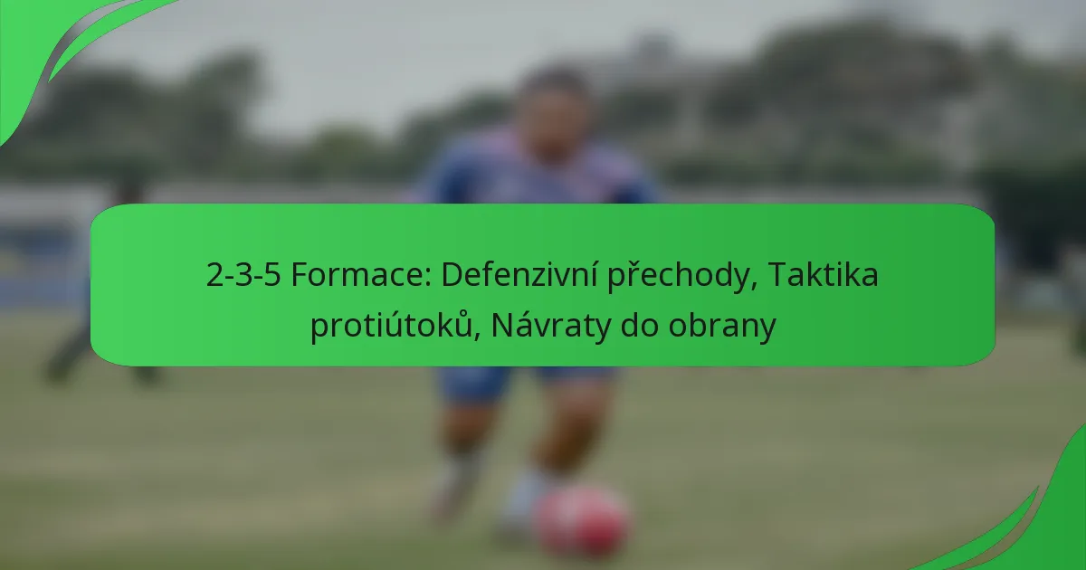 Formace 2-3-5 je tradiční fotbalové uspořádání, které upřednostňuje ofenzivní hru díky svému rozložení dvou obránců, tří záložníků a pěti útočníků. Klíčové pro její efektivitu jsou obranné přechody, které zahrnují rychlé přechody do obranné pozice po ztrátě míče, a taktiky proti-pressingu, které mají za cíl rychle získat míč zpět a využít slabin soupeře. Důležité jsou také návraty, protože hráči musí být připraveni se vrátit a podpořit obranu, aby udrželi strukturu týmu a minimalizovali šance na skórování pro soupeře.